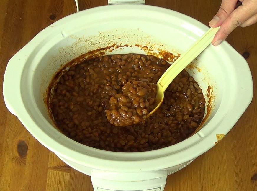 Add the beans, the onion/beer mixture, and all of the other ingredients to a big slowcooker and mix well.