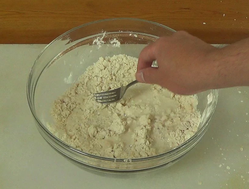 Mix in the water with a fork to make larger clumps.