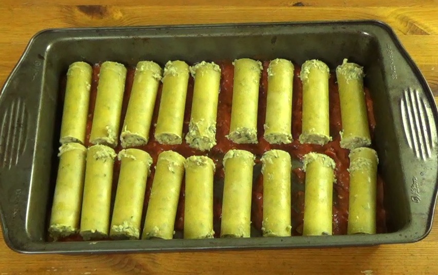 Place each cannelloni in the baking pan as you finish it. This batch of filling should make about 18 of them.