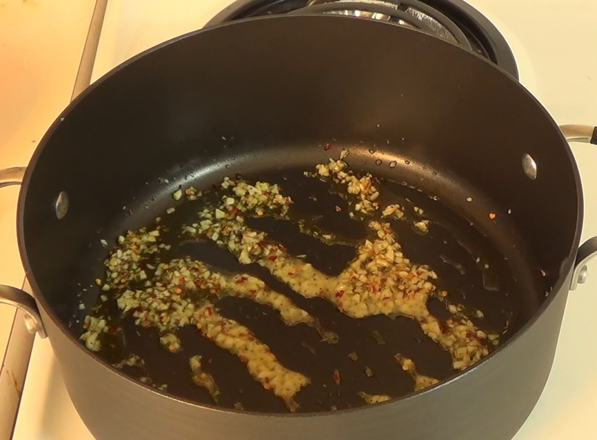 Heat the olive oil and coconut oil over medium heat. Add garlic and saute a minute or so until fragrant, but don't let the garlic turn brown. Add oregano and red chili flakes and saute a minute more.