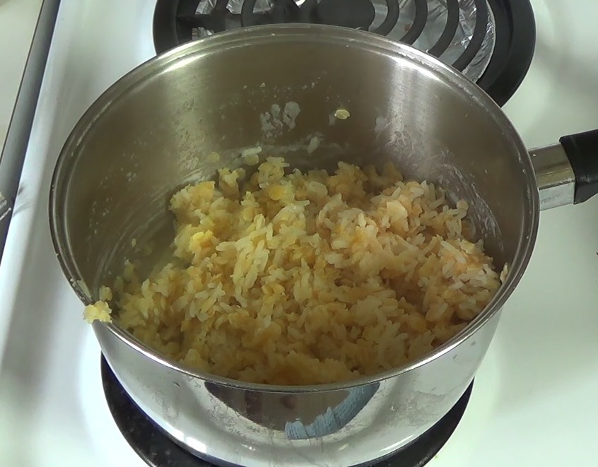 Put water, rice, lentils and salt in a medium pot with a lid. Bring to a boil, then reduce to simmer, cover and let cook 15 minutes. Remove heat and let cool.