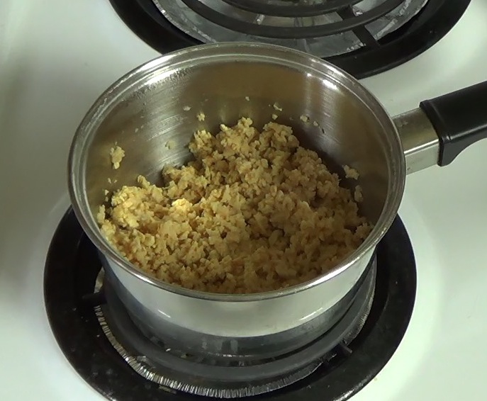 Put 1/2 cup of water on to boil in a small pot with a lid. When boiling, turn off heat, mix in TVP, cover, place on a cool element, and let sit 10 minutes, stirring occasionally.