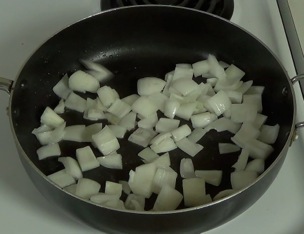 When you're done prepping, heat a large, deep frying pan over medium high heat and add the oil. When the oil is hot, carefully add the onion and stirfry for about 3 minutes.