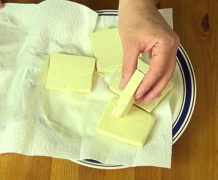 Place a single layer of the tofu squares on a paper-towel-covered plate and press out the moisture using a second paper towel.