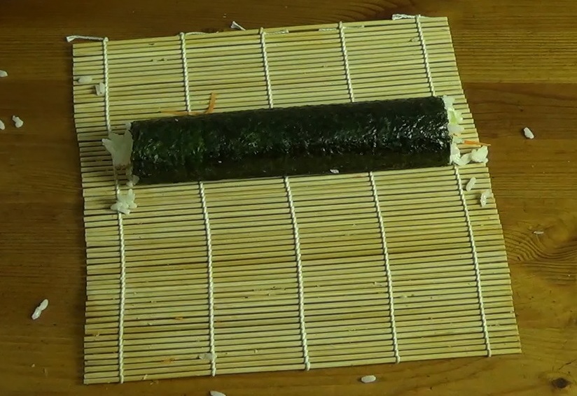 Rolling is still a bit of a tricky skill, but it has 3 steps: (1) get the edge of the nori closest to you over to the opposite side, (2) use the mat to tighten the roll by pulling toward you, and (3) finish the roll by rolling over the edge of the nori with no rice on it and shape the roll with the mat.