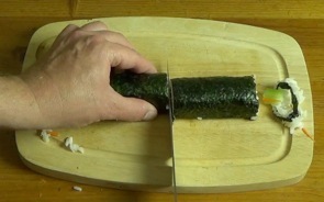 Finally, get a sharp knife and a damp cloth. Slice the sloppy ends off the roll (unless you've laid it out perfectly, in which case my hat is off to you). Then slice the roll in half and slice each half into 3 pieces. Use long, slow slices through the rice and fillings, and make sure you get all the way through the nori on the bottom.