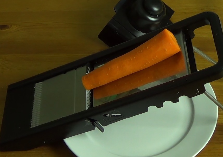 Of course, the cucumber and carrot doesn't come in such readymade sushi shapes and sizes, so a little cutting is required. Carrot is best in small shreds. And small shreds of carrot are easiest to produce with a mandoline.