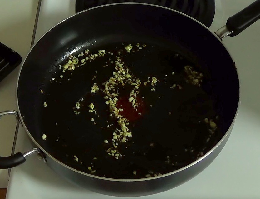 Roughly chop the garlic with a little salt (salt brings out the garlic flavour), then add chili flakes (if using) and continue mincing until the garlic and chili are well integrated and the garlic is in small chunks. Add garlic/chili mixture to the frying pan with the olive oil and mix. Just let the oil soak in the garlic flavour on low heat until the pasta is almost ready.