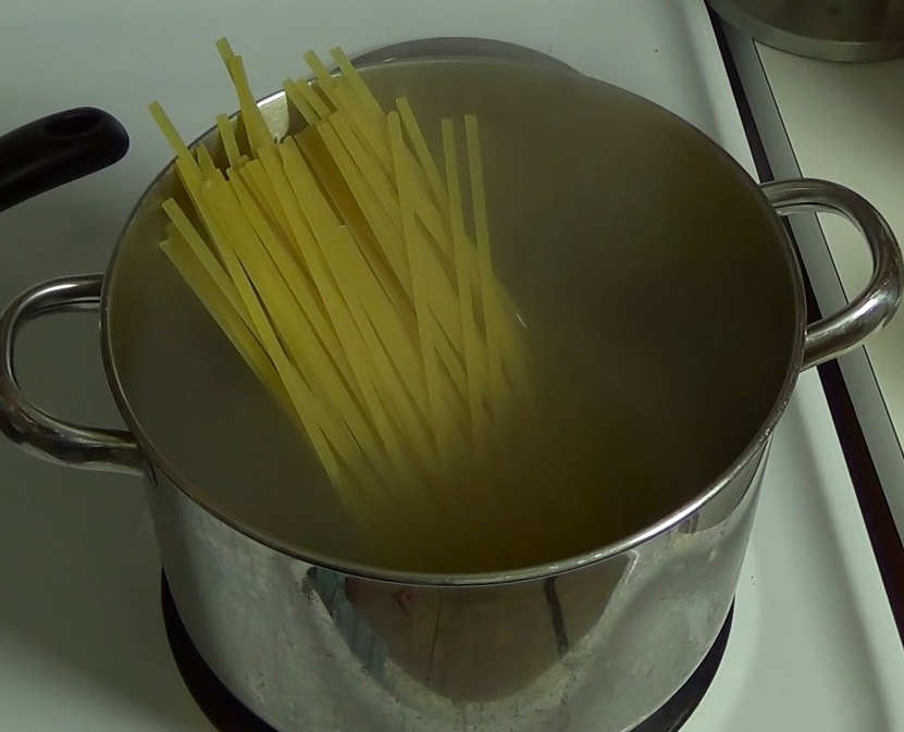 Bring a big pot of heavily salted water to a rolling boil. Set a timer for 9 minutes. Add the fettuccine and mix it into the water.