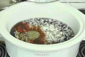 Drain the beans, discarding the water, and rinse them well. Put the beans along with all of the other ingredients except the oil and salt in a large slow cooker (mine is 6 quarts).