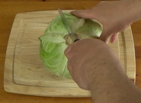 If you haven't already, cut the cabbage in half from the root. Wrap one half in plastic wrap and put it back in the fridge for something else.