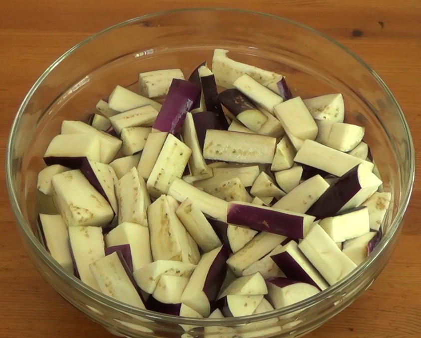Place the eggplant slices into a large bowl of water with 2 tsp of salt added. Let them rest there while you prepare the other ingredients. (You'll drain them and dry them with paper towel (to avoid a nasty splattering reaction with the hot oil) just before adding them to the wok.)