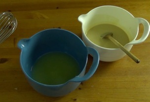 Put the tahini paste in one bowl and the lemon juice in a second bowl with the salt. Mix the contents of both bowls well. (The oil in the tahini probably separated, so it will need a particularly good mix.)