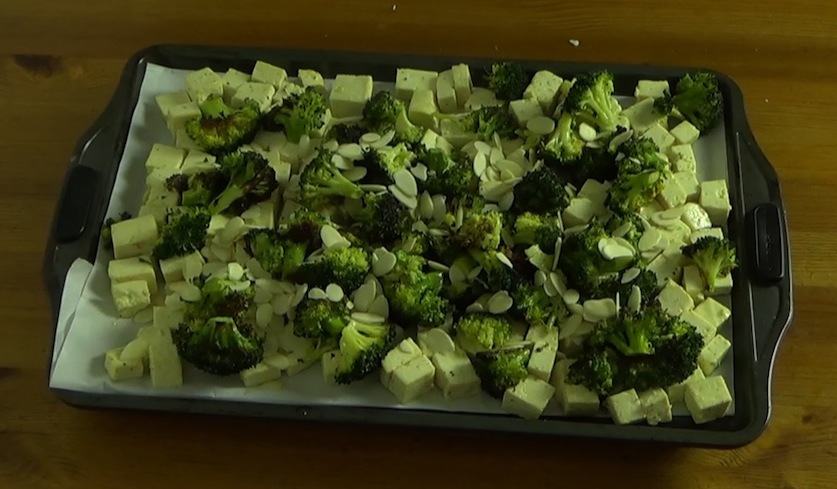 When the tofu has been cooking for 10 minutes, remove it from the oven and add the broccoli and slivered almonds on top.