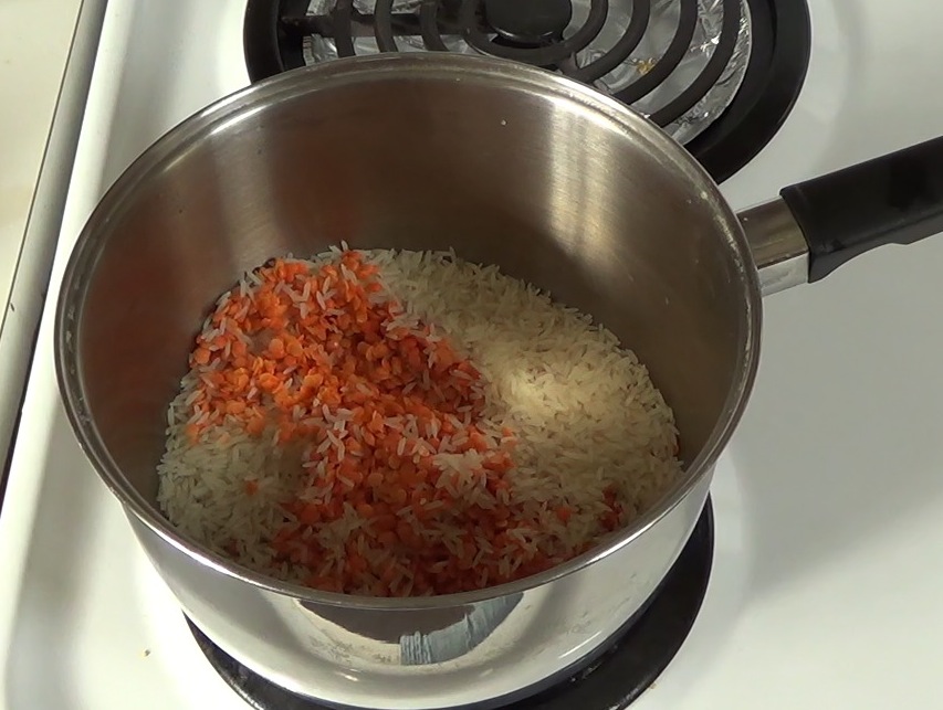 Put water, rice, lentils and salt in a medium pot with a lid. Bring to a boil, then reduce to simmer, cover and let cook 15 minutes. Remove from heat, fluff with a fork, return cover and let cool.